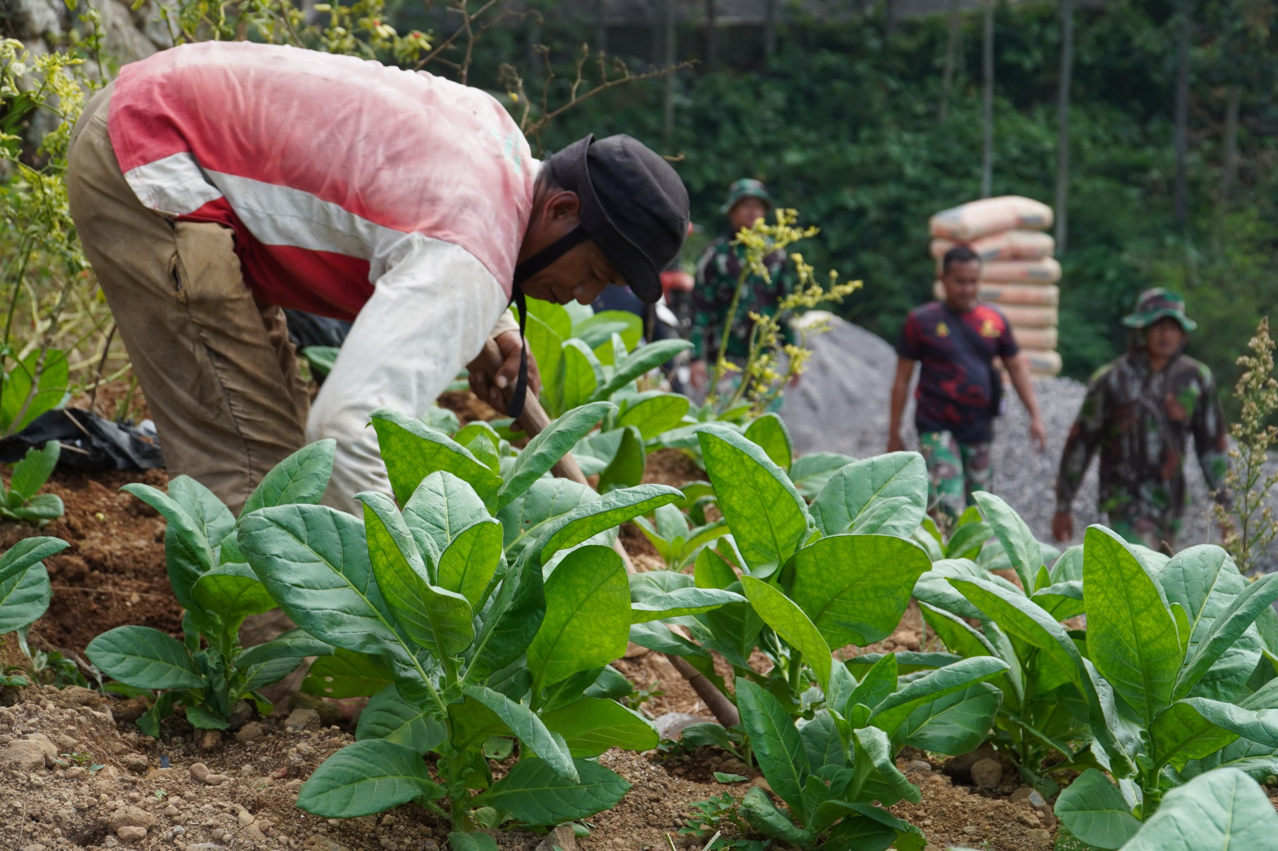 Pemandangan ini menggambarkan sinergi luar biasa antara program pembangunan fisik TMMD dan aktivitas masyarakat. Sambil memantau proses pengecoran jalan, Bapak Mulyono terlihat tekun merapikan lahannya, memanfaatkan momentum baik ini untuk mempersiapkan masa panen mendatang.