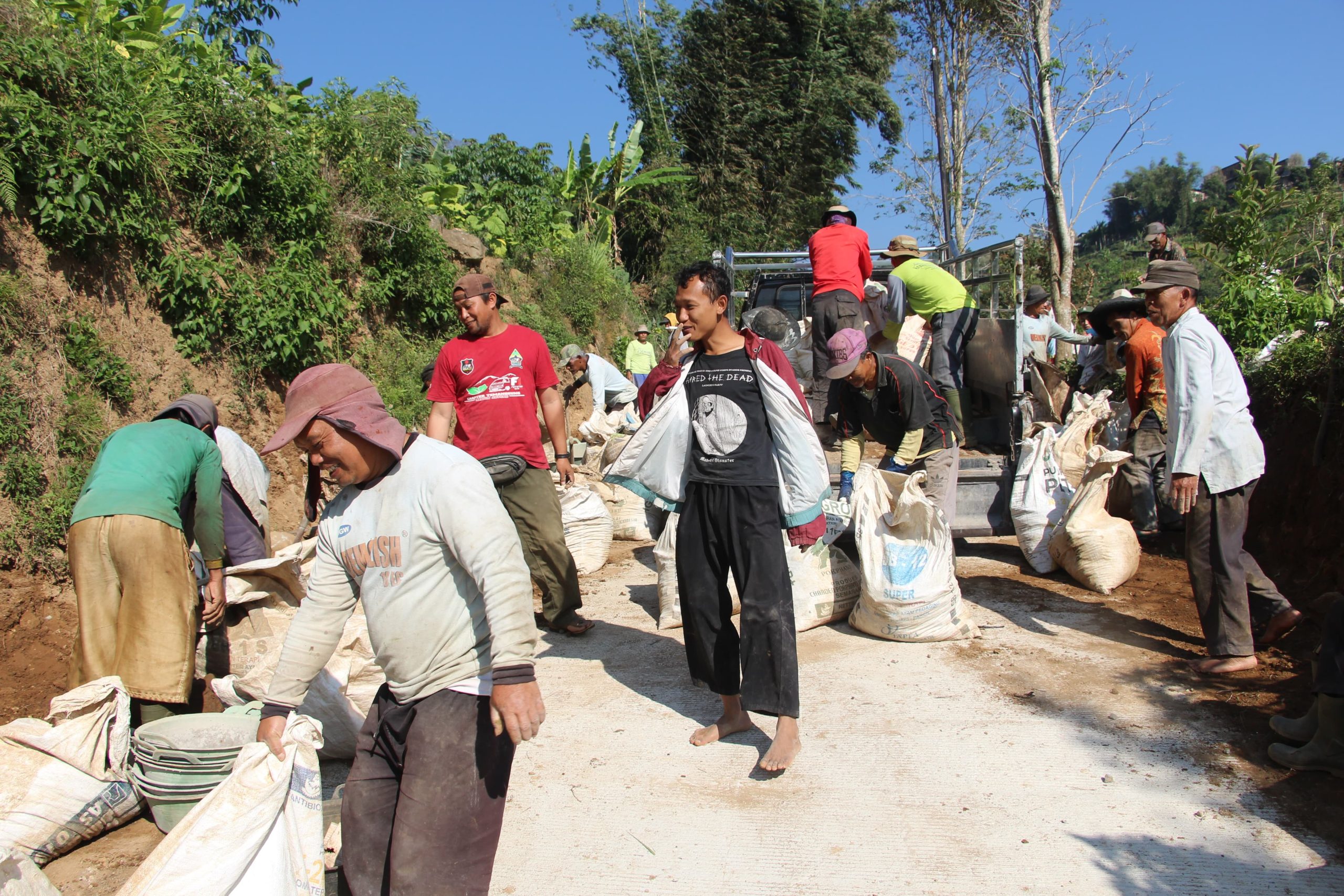 “Dulu kami harus memutar jauh kalau ke Kemloko, apalagi kalau musim hujan, jalan tanahnya licin dan susah dilalui. Sekarang sudah dicor, kami bisa lebih cepat ke ladang dan ke pasar,” ujar  Rizal warga Desa Banaran yang ikut mengangkut tanah dengan karung.
