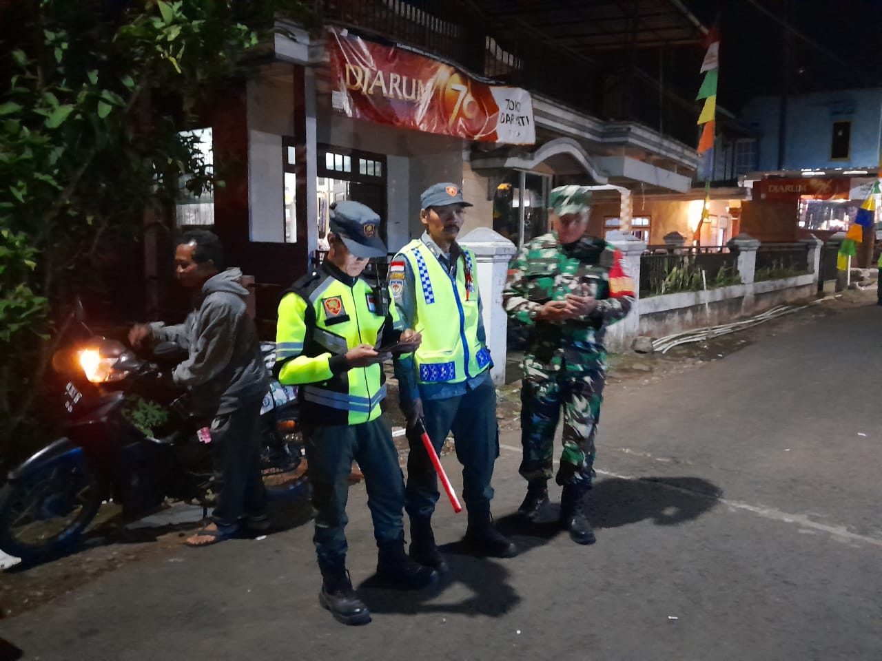 Tidak ketinggalan, Koramil 03/Parakan melaksanakan patroli malam bersama Linmas, relawan, dan security. Fokus kegiatan menyasar area Pasar Legi Parakan untuk mencegah tindak kriminal sekaligus mempererat komunikasi antara aparat dan warga.