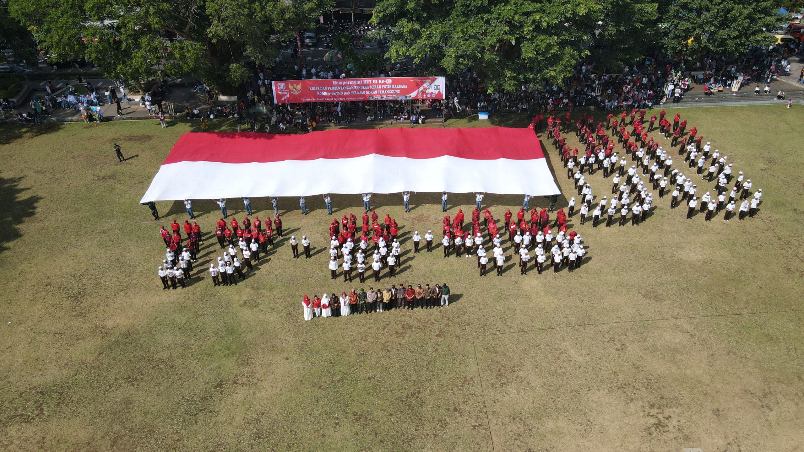 Atmosfer semakin menggetarkan ketika bendera merah putih raksasa dibentangkan megah di tengah alun-alun, lengkap dengan ornamen angka 80, 17-08-45, sebagai simbol usia kemerdekaan Indonesia. Tak hanya itu, flash mob tari jaran kepang yang diikuti oleh 1.800 siswa SMK Mipha dan para pejabat Forkopimda menambah semarak suasana dengan tarian yang menyatu dalam semangat kebangsaan.