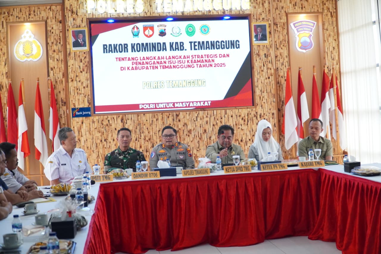 Rapat strategis ini dipimpin langsung oleh Kapolres Temanggung, AKBP Rully Thomas, SH., S.I.K., M.I.K., dan diikuti oleh seluruh jajaran Forum Koordinasi Pimpinan Daerah (Forkopimda) Kabupaten Temanggung. Agenda utama membahas langkah-langkah strategis serta penanganan isu-isu keamanan yang berpotensi muncul di wilayah Temanggung.