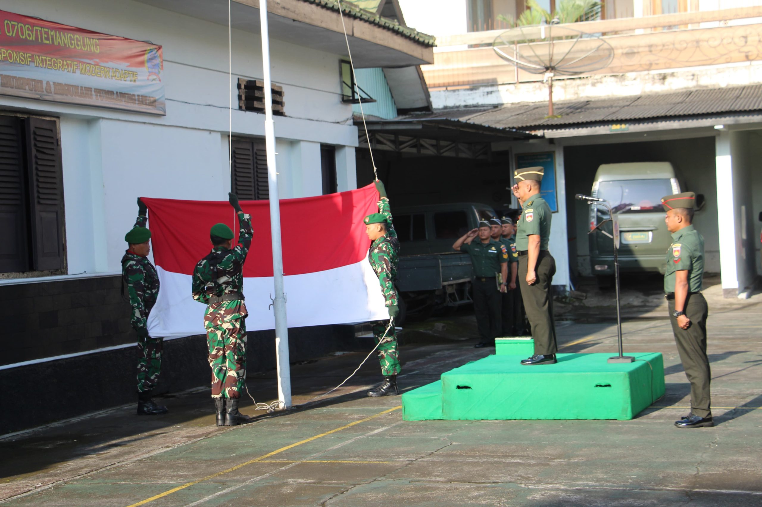 Kepala Staf Kodim (Kasdim) 0706/Temanggung Mayor Cba Agus Jumawan bertindak selaku Inspektur Upacara, sementara Komandan Upacara dijabat Danramil 09/Kaloran Kapten Inf Asrori dan Perwira Upacara Danramil 07/Wonoboyo Kapten Cba Dilli Yudha. Petugas upacara berasal dari Koramil 13/Kranggan.